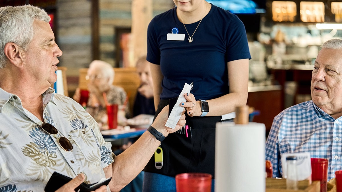 When it comes time to pay the bill after a meal, the best way to get a server's attention is to make eye contact and give a little wave, an expert said. (iStock)